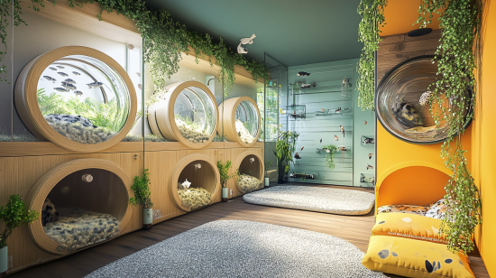 Clean, attractive color schemes and details like polka dots and confetti patterns add a touch of style to your pet’s home.