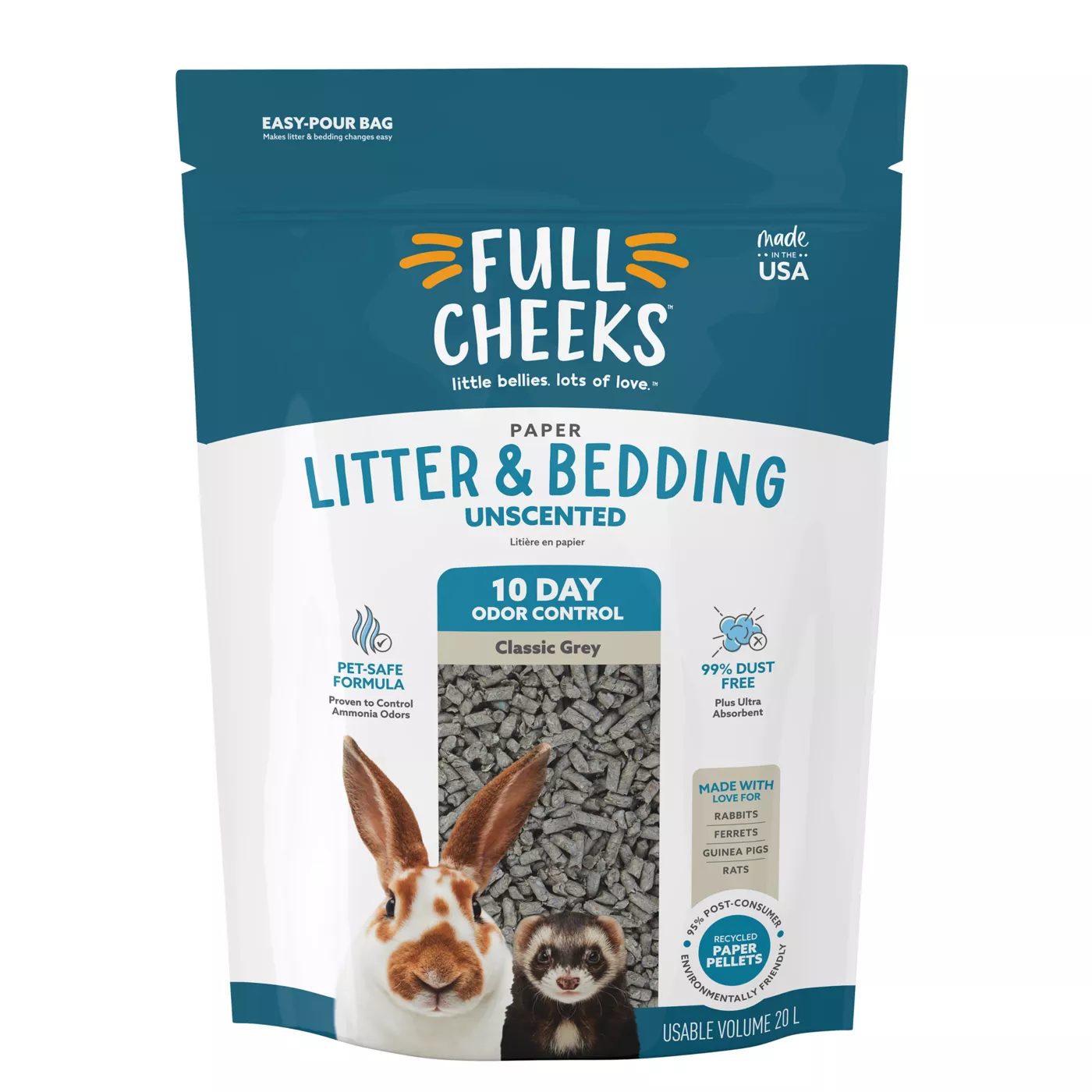 - A cozy home starts with clean, comfy bedding, and Full Cheeks® Small Pet Unscented Classic Grey Paper Litter & Bedding leaves their paws dry and cushioned and their habitat cleaner for you. Made with love for rabbits, ferrets, guinea pigs and rats, this soft, ultra-absorbent paper litter and bedding keeps pets dry and maintains freshness. It is also proven to help control ammonia odors. We believe caring for your furry little one should be as easy as loving them, and now it can be. Our products are specially made for them, and are designed to be simple for you. All they need to do is what they do best: give lots of love.