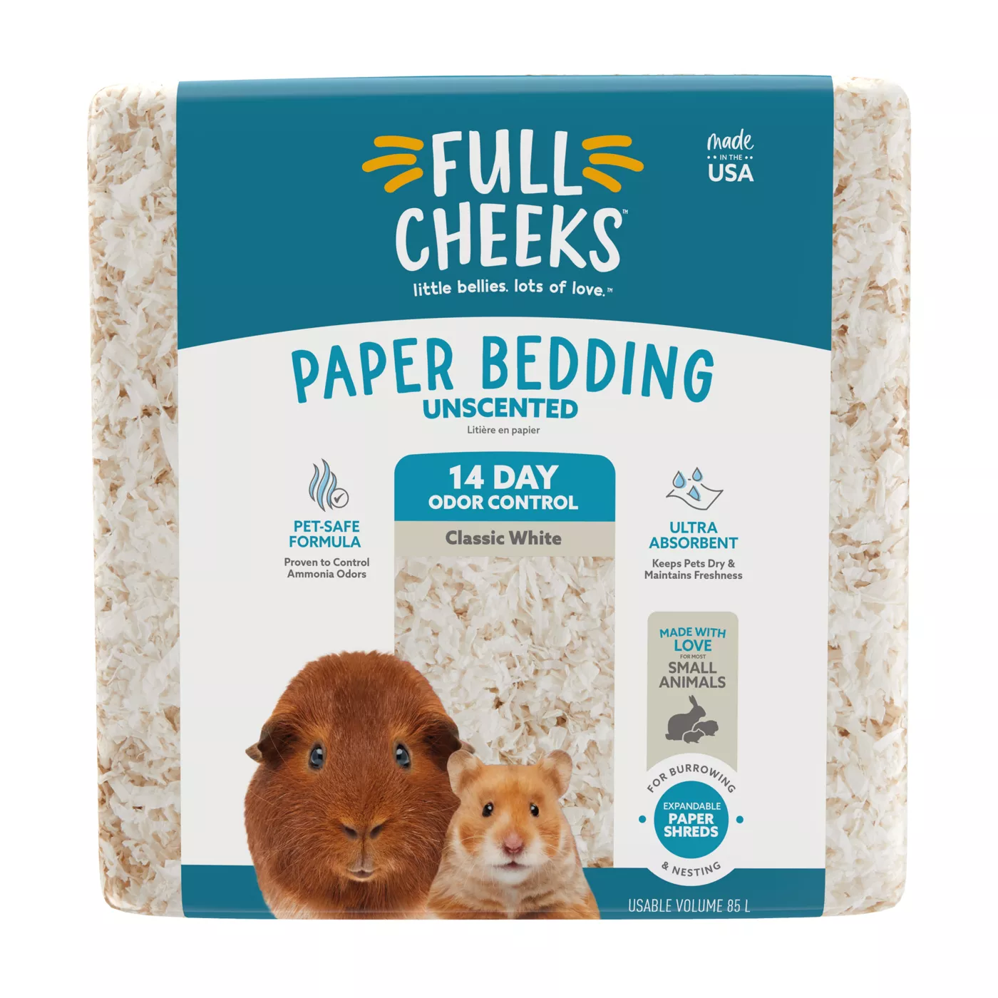 - A cozy home starts with clean, comfy bedding, and Full Cheeks Unscented Classic White Paper Bedding leaves their paws dry and cushioned and their habitat cleaner for you. Made with love for most small animals, this soft, ultra-absorbent paper bedding supports natural burrowing and nesting behavior. It is also proven to help control ammonia odors. We believe caring for your furry little one should be as easy as loving them, and now it can be. Our products are specially made for them, and are designed to be simple for you. All they need to do is what they do best: give lots of love.